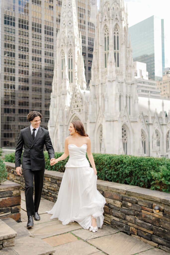 The contrast of historic stonework and modern glass skyscrapers creates a layered, editorial feel perfect for couples who love timeless elegance with a fashion-forward edge.